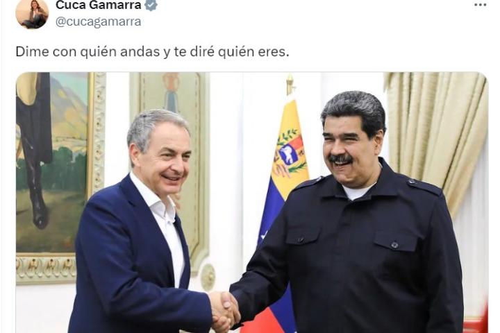 Gamarra subió a la red social X una foto en la aparece el propio Zapatero estrechándose la mano con el presidente de Venezuela, Nicolás Maduro. "Dime con quién andas y te diré quién eres", escribió la dirigente del PP.
