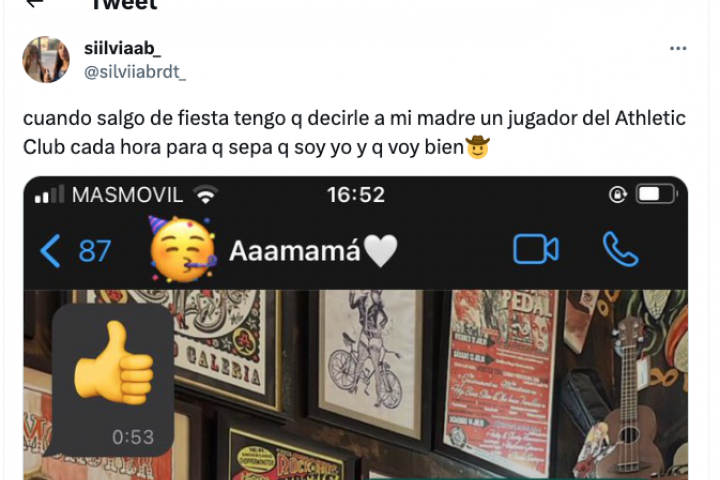 "Cuando salgo de fiesta tengo que decirle a mi madre un jugador del Athletic Club cada hora para que sepa que soy yo y que voy bien🤠", ha escrito junto a una captura de una conversación de WhatsApp con su madre.