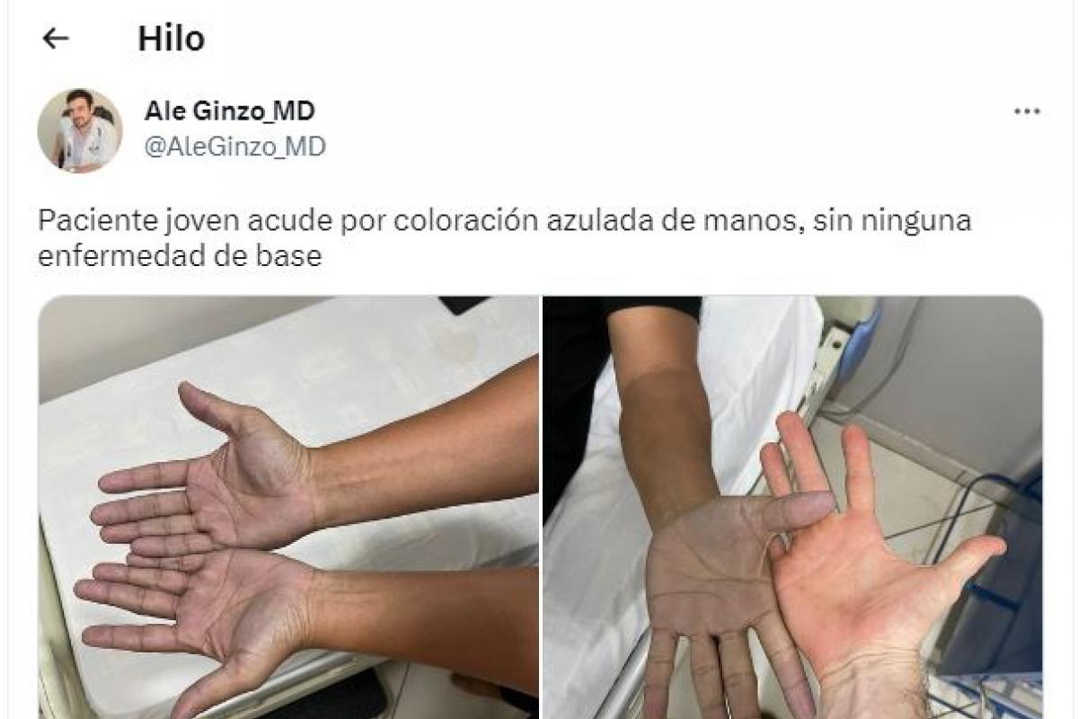 El hombre, médico, ha publicado el caso que vio en su centro y lo ha acompañado con fotos del paciente en cuestión: "Paciente joven acude por coloración azulada de manos, sin ninguna enfermedad de base".