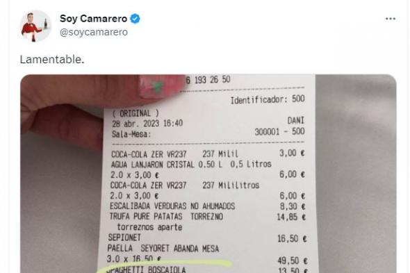 La imagen la ha compartido la popular cuenta de Twitter @soycamarero, aunque la propia comensal en cuestión también lo mostró en sus stories de Instagram.