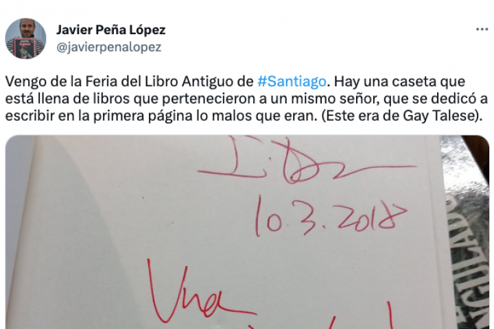 "Hay una caseta que está llena de libros que pertenecieron a un mismo señor, que se dedicó a escribir en la primera página lo malos que eran. (Este era de Gay Talese)", ha escrito Peña López junto a unas de esas opiniones: "¡Una mierda! ¡Une mierde! ¡Unha merda! Fuck book!".
