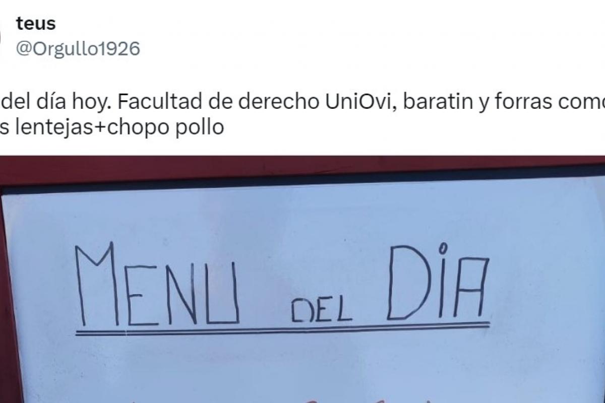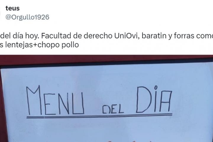 "Menú del día hoy. Facultad de derecho UniOvi, baratin y forras como dios con las lentejas más cachopo pollo", ha escrito el tuitero @Orgullo1926, que ha sido el que ha compartido la imagen en redes sociales.