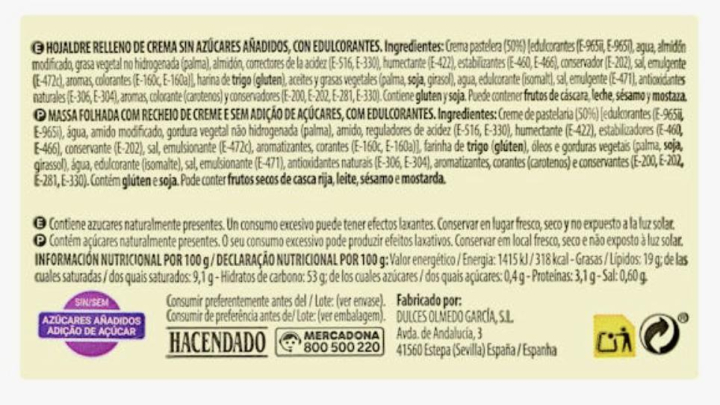 En la web de Mercadona se puede ver que a este producto lo llaman "hojaldre relleno de crema Hacendado sin azúcar añadido", que tiene 0,4% de azúcares y 300 calorías por 100 gramos de producto.