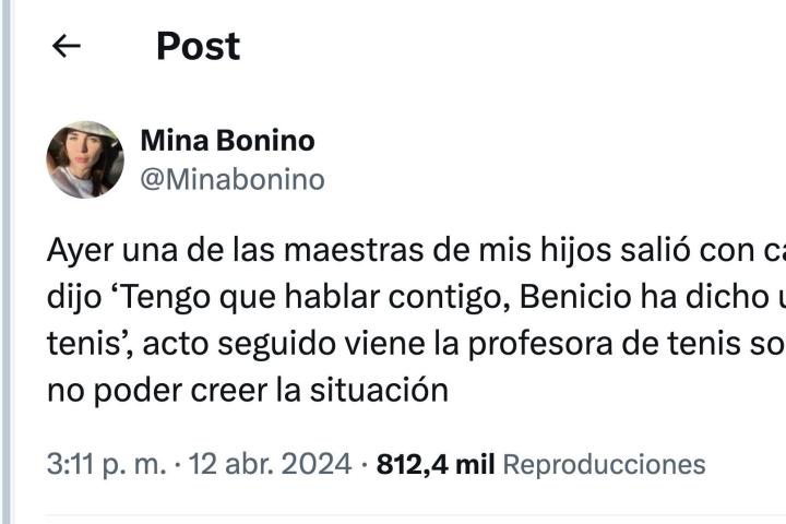 "Ayer una de las maestras de mis hijos salió con cara de tragedia y me dijo ‘Tengo que hablar contigo, Benicio ha dicho un insulto en la clase de tenis’, acto seguido viene la profesora de tenis sorprendida, con cara de no poder creer la situación", ha empezado contando en la red social de Elon Musk.