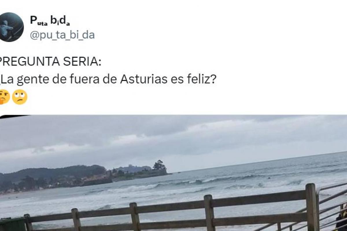 "PREGUNTA SERIA: ¿La gente de fuera de Asturias es feliz? 🤔🙄", preguntaba, junto a una imagen de la costa en un día nublado y por lo que se ve con temperaturas no muy altas, ya que las personas de fondo van abrigadas. Además, muestra la sidra, una ración de chopitos, otro de pimientos y una tercera de patatas.