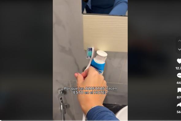 "¿Por qué las azafatas hacen esto en el hotel?", pregunta en un vídeo en el que se ve cómo agarra su cepillo de dientes del típico vaso del lavabo y lo mete en la caja de seguridad, dentro del armario de la habitación.