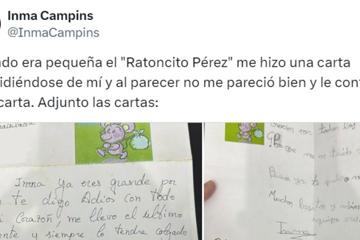 La usuaria de la red social X @InmaCampins ha mostrado la carta que le envió el Ratoncico Pérez cuando era niña y la respuesta que le escribió no tiene despercio y ya acumula miles de me gusta.