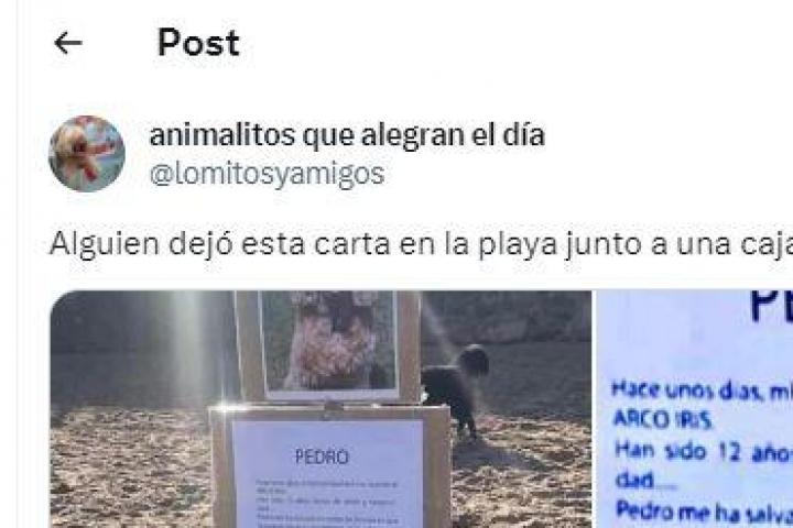 "Hace unos días, mi fiel compañero cruzó el arco iris. Han sido doce años llenos de amor y complicidad... Pedro (nombre de su perro) me ha salvado en todas las formas en que se puede salvar a una persona en la vida... Nuestros paseos por la playa que tanto le gustaban y disfrutábamos", ha empezado dejando por escrito el dueño del animal.