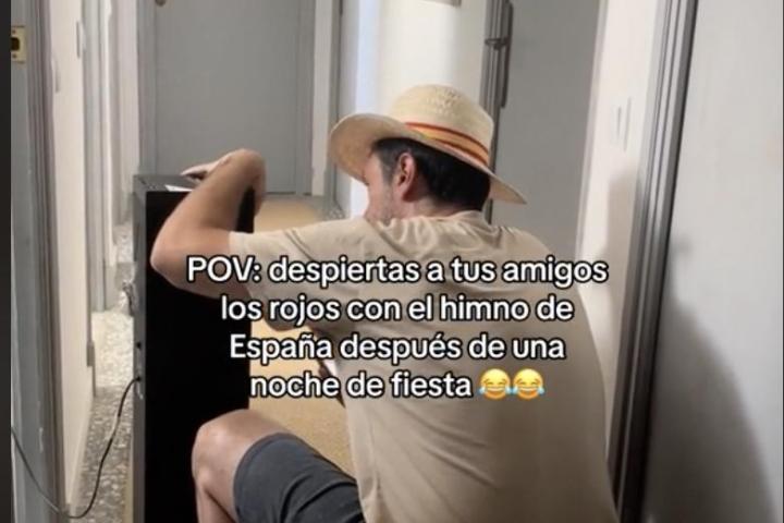 El enunciado del vídeo, de lo más sencillo y atractivo para atraer visitas, ha tenido mucho que ver: "Despiertas a tus amigos los rojos con el himno de España después de una noche de fiesta".