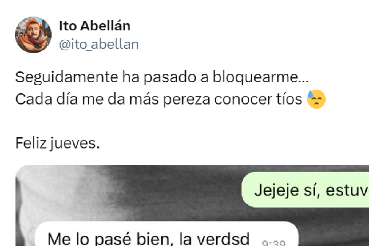 "Seguidamente ha pasado a bloquearme… Cada día me da más pereza conocer tíos😓Feliz jueves", ha escrito el protagonista, junto a la imagen de la conversación con los cuatro mensajes que se pueden leer.