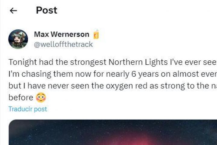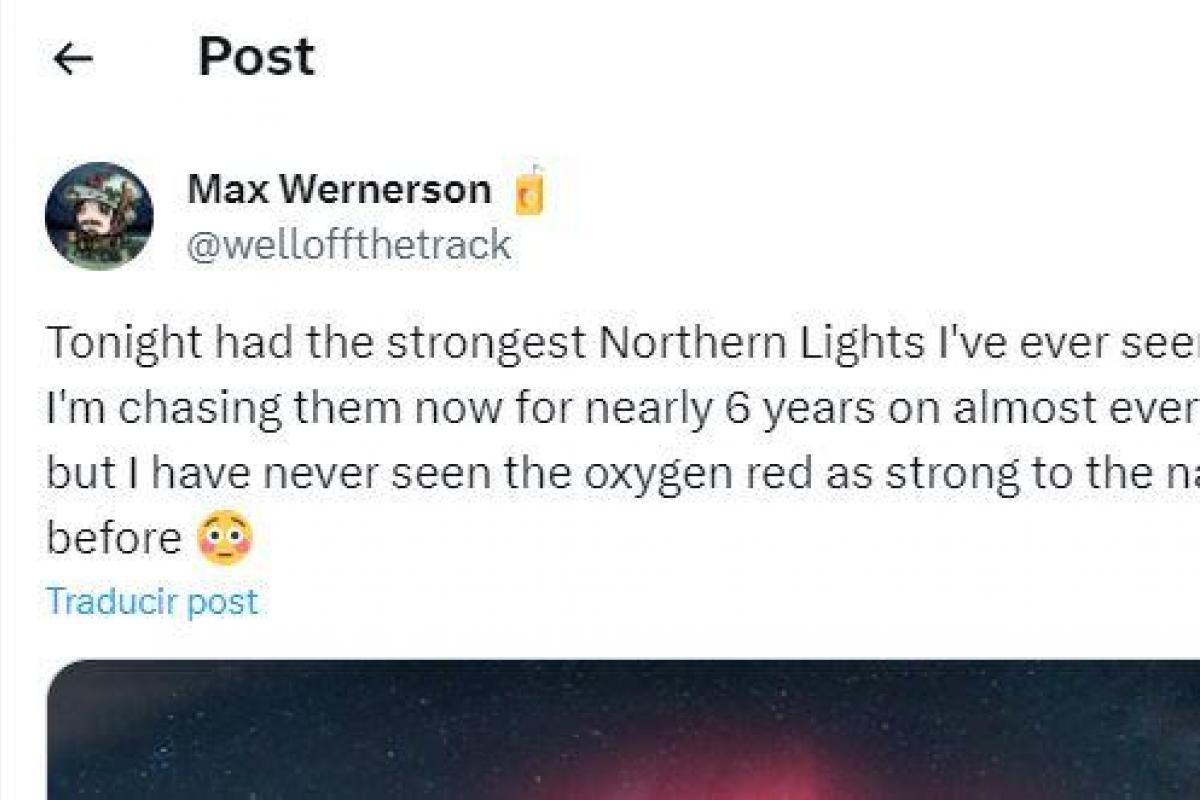 El fotógrafo Max Wernerson ha publicado en su cuenta de X (@welloffthetrack) una fotografía de "la aurora boreal más fuerte" que ha visto en su vida tras seis años persiguiendo una.