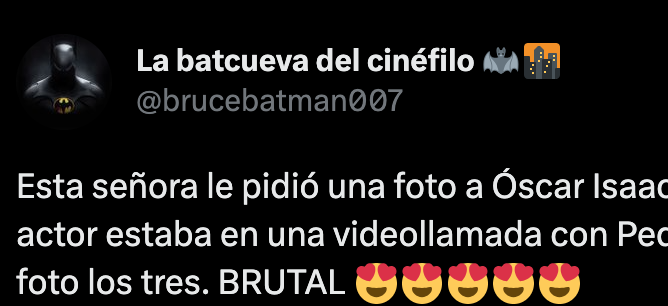"Y se sacaron una foto los tres. BRUTAL", ha agregado a continuación. Junto a estas palabras, además, ha subido la fotografía en cuestión, en la que se ve a la mujer y al actor Óscar Isaac mostrando a Pedro Pascal en la pantalla de su móvil.