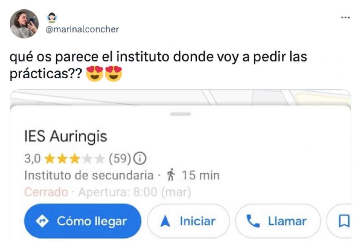 La usuaria de Twitter @marinalconcher ha publicado uno de los mensajes más comentados de los últimos días en la red social al compartir la foto que de un instituto de Jaén que aparece en Google.