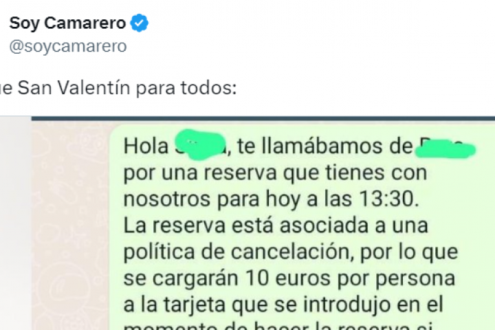Así, a las 13:52 al ver que no acudían tras haber hecho una reserva, el establecimiento se puso en contacto con el teléfono que les facilitaron. "Hola, te llamábamos por una reserva que tienes con nosotros para hoy a las 13:30. La reserva está asociada a una política de cancelación, por lo que se cargarán 10 euros por persona a la tarjeta que se introdujo en el momento de hacer la reserva si finalmente no acudís. Quedamos a vuestra disposición", les comunicaron.