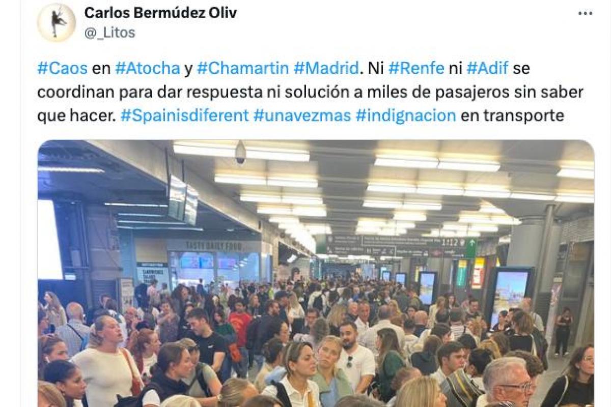 "Caos en Atocha y Chamartin Madrid. Ni Renfe ni Adif se coordinan para dar respuesta ni solución a miles de pasajeros sin saber qué hacer. #Spainisdiferent unavezmas indignación en transporte", ha escrito junto a la foto.