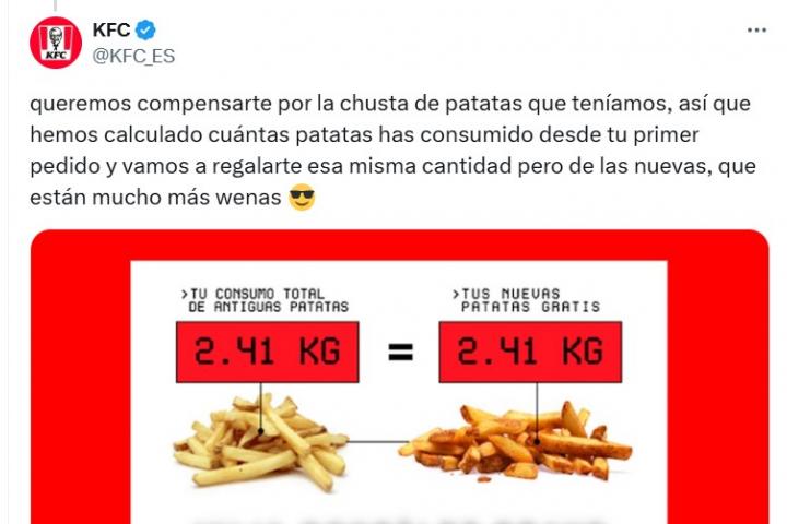 La empresa se dirigió a sus seguidores en la red social X diciendo: "Chavales, si os llega un mail sobre unas nuevas patatas, canjead el código y corred con el recipiente más grande que tengáis a cualquier kfc".