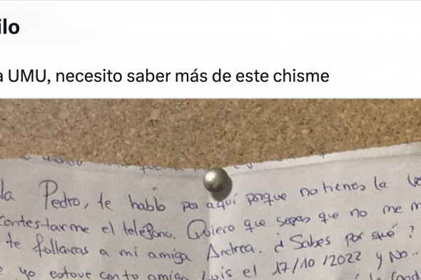 El tuit con la nota se ha convertido en todo un éxito en Twitter y lleva en pocas horas más de 2.500 me gusta'. "Visto en la UMU, necesito saber más de este chisme", reza el enunciado el mensaje.