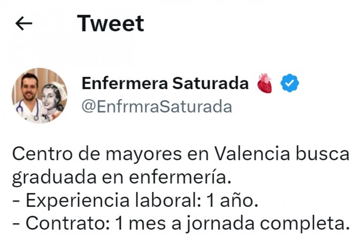 "Centro de mayores en Valencia busca graduada en enfermería. - Experiencia laboral: 1 año. - Contrato: 1 mes a jornada completa. - Salario bruto: por debajo del mínimo interprofesional.", ha señalado en el tuit, junto a una imagen de la propuesta de trabajo.