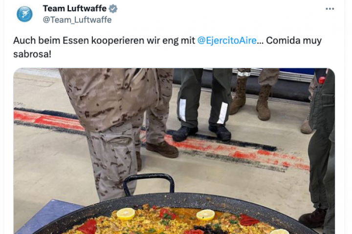 "También cooperamos estrechamente en el ámbito de la alimentación. Ejército del Aire de España, comida muy sabrosa", ha escrito el perfil del Team Luftwaffe junto a la imagen del arroz.