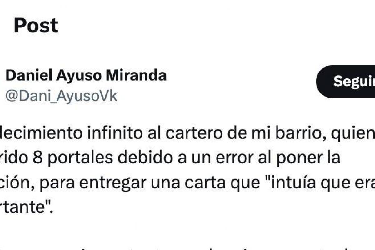 "Agradecimiento infinito, porque ha recorrido ocho portales, debido a un error al poner la dirección, para entregar una carta que intuía que era importante", ha escrito el tuitero emocionado.