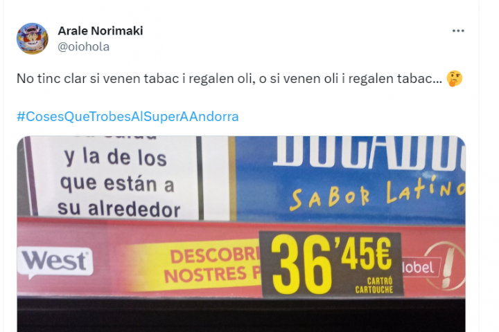 Con este panorama, no es rara la imagen que se ha encontrado en una tienda de Andorra el usuario de Twitter @oiohola, que ha publicado una foto de lo más curiosa: en ese establecimiento regalaban una botella de aceite con la compra de un cartón de tabaco.