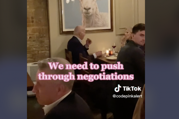CODEPINK se define como una "organización dirigida por mujeres que trabaja para poner fin a las guerras y el militarismo de Estado Unidos". La asociación ha publicado un vídeo en TikTok (@codepinkalert) en el que aparece el presidente estadounidense Joe Biden comiendo mientras algunos miembros de la organización, de pie y a pocos metros de él, le piden que ponga fin a la guerra.