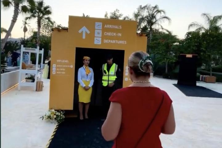 Ya dentro, todas las personas que atienden a los invitados también parecen azafatas, hay maletas, pantallas que emulan las salidas y llegadas de aviones...