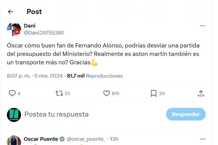 "Realmente es Aston Martín también es un transporte más, ¿no? Gracias", añadió. Lo que pocos podían imaginar es que el propio Óscar Puente respondiese. Y de qué forma.