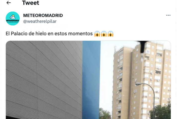 En medio de ese caos, el usuario de Twitter @weatherelpilar publicó una foto del Palacio de Hielo de la capital junto a un tramo de carretera completamente inundada. De hecho, los coches que estaban en la zona aparecen cubiertos de agua.