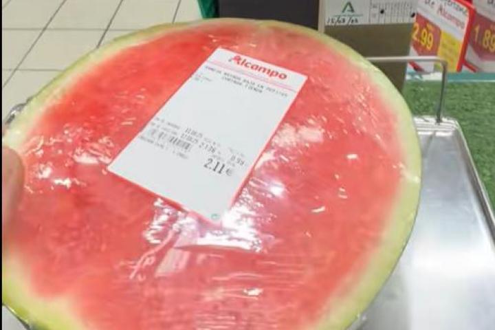 En concreto, en el vídeo se puede ver como media sandía ya preparada vale 2,11 euros, un precio que cambia cuando el usuario la pesa en la báscula, donde la misma sandía marca 1,47 euros.