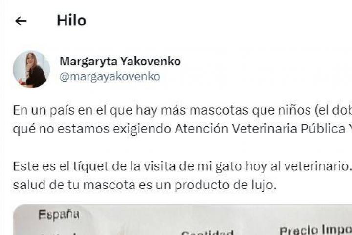 "En un país en el que hay más mascotas que niños (el doble), no sé por qué no estamos exigiendo Atención Veterinaria Pública YA", ha planteado, a modo de reflexión, la usuaria de Twitter @margayakovenko.
