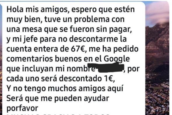 En el pantallazo que ha subido a X la popular cuenta @soycamarero se puede leer el mensaje del trabajador: "Hola, mis amigos. Espero que estén muy bien. Tuve un problema con una mesa que se fueron sin pagar y mi jefe, para no descontarme la cuenta entera de 67 euros, me ha pedido comentarios buenos en el Google que incluyan mi nombre".