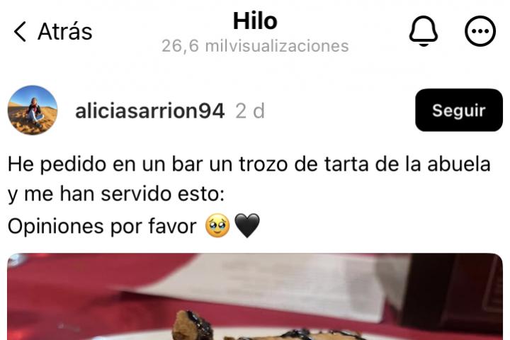 "He pedido en un bar un trozo de tarta de la abuela y me han servido esto. Opiniones por favor", ha escrito junto al plato en cuestión, compuesto por lo que parecen tres o cuatro galletas rociadas con sirope de chocolate.