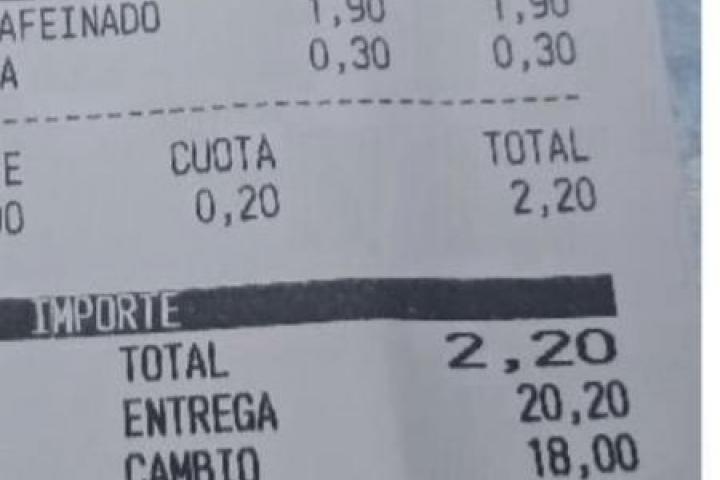 Esta persona ha adjuntado en el ticket donde se puede ver precisamente que el café con leche vale 1,90 y hay un suplemento de 30 céntimos por la leche sin lactosa, que hace un total de 2,20 euros.