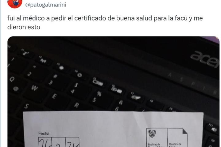 El usuario @patogalmarini ha publicado en X, antes conocido como Twitter, un tuit en el que cuenta que ha ido al médico para pedir un certificado de buena salud que quiere entregar en la facultad en la que estudia y lo que le han dado ha generado miles de 'me gusta'.