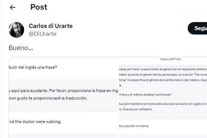 "La enfermera y el médico estaban caminando", ha contestado ChatGPT. El tuitero le ha replicado, a modo de corrección, por qué ha decidido "que 'nurse' es una mujer y 'doctor' es un hombre".