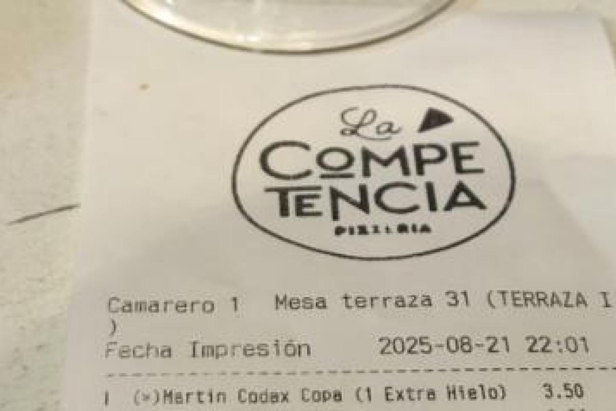 En concreto, en la imagen de la cuenta de la pizzería La Competencia se puede ver como hay un precio diferente para dos copas del mismo vino, una con un precio de 3,50 euros y que vale 3,20.