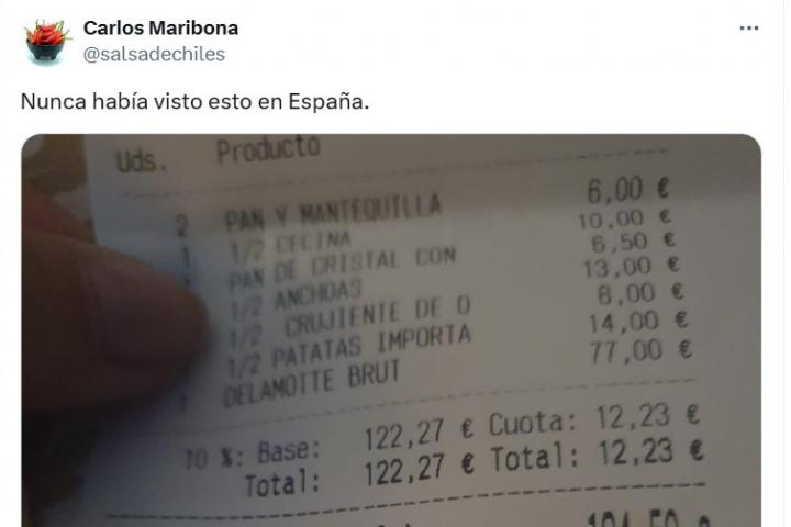 "Nunca había visto esto en España", ha subrayado Maribona, cuya imagen ha provocado multitud de reacciones, entre las que destaca la de un usuario que dice: "Soy de los que habitualmente dejan propina, pero si me la meten en el ticket no dejo ni un céntimo. Que tome nota quien corresponda".