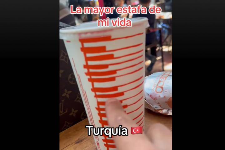 Ha enseñado lo que incluía el menú: una Coca-Cola de tamaño grande de máquina (es decir, polvos y agua), patatas congeladas, dos alitas y una hamburguesa. Por esos productos le ha costado comer unos 60 euros aproximadamente.