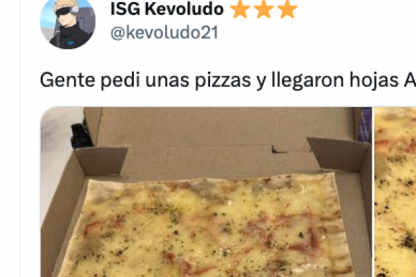 Y, si no, que se lo digan al usuario de Twitter @kevoludo21, que ha subido a esa red social dos fotos de lo que le llegó tras pedir pizza. "Gente, pedí unas pizzas y llegaron hojas A4 con queso", ha escrito junto a las imágenes.