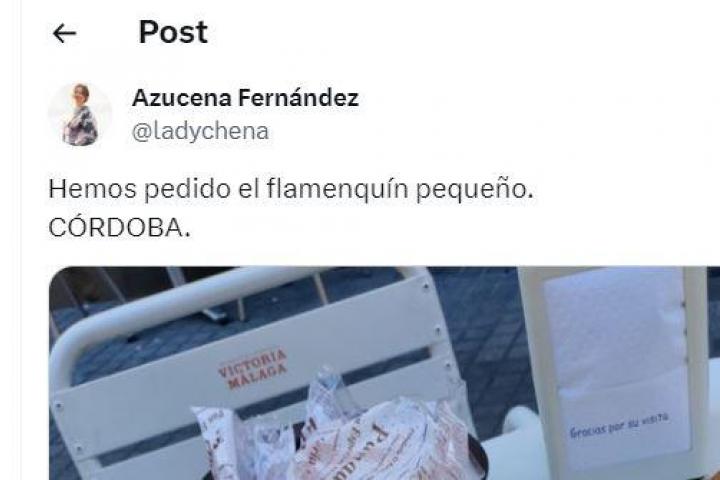 La escritora Azucena Fernández ha compartido en su cuenta de X (@ladychena) una fotografía del flamenquín que le han cocinado en un bar de Córdoba.