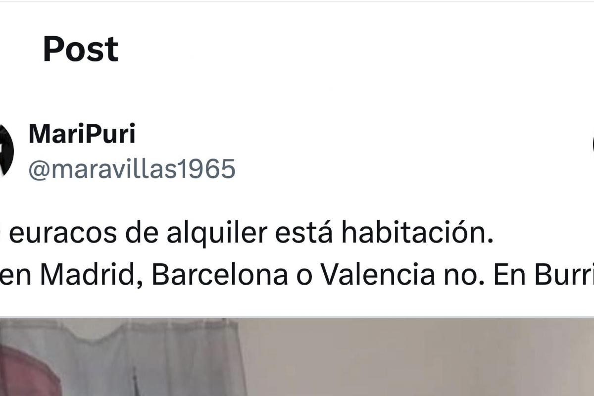 "300 euracos de alquiler está habitación. No, en Madrid, Barcelona o Valencia no. En Burriana, tetes", ha escrito en la red social de Elon Musk la usuaria en cuestión en una publicación que supera los 2.000 'me gusta' y el medio millón de personas alcanzadas.