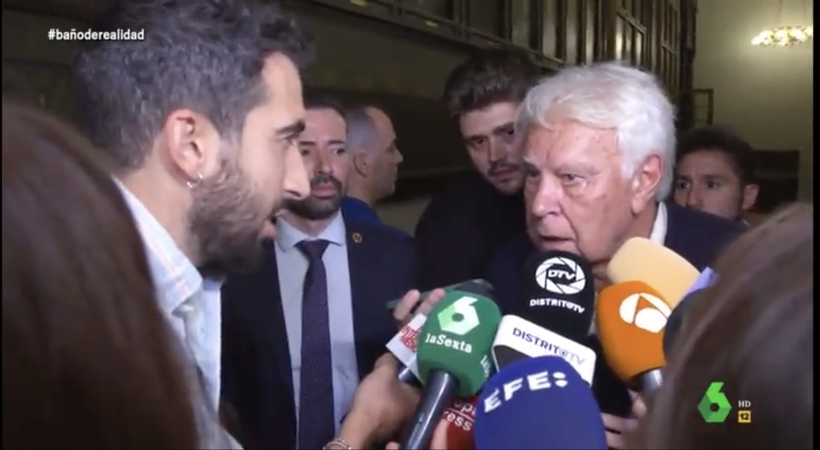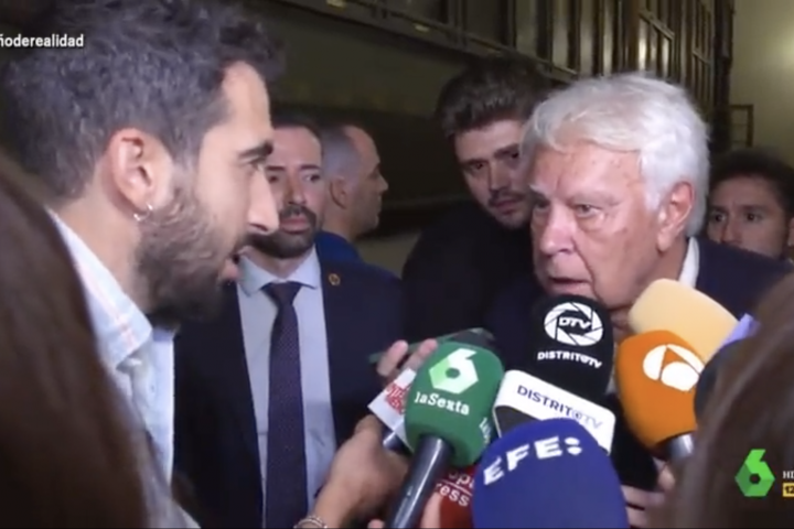 Juárez le pide permiso al expresidente del Gobierno para acercarse, que adelanta que no va a decir nada. "Sólo le voy a preguntar un poco, un día de reconciliación, un día bonito", señala el reportero antes de que González lo interrumpa.