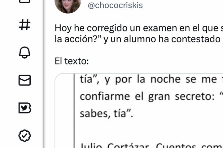 La última de estas respuestas tiene que ver con Julio Cortázar y lo que parece un examen o un ejercicio de Lengua. "Hoy he corregido un examen en el que se preguntaba '¿dónde tiene lugar la acción?' y un alumno ha contestado 'En Alfaguara, México'. El texto", ha escrito la autora del tuit en la red social de Elon Musk.