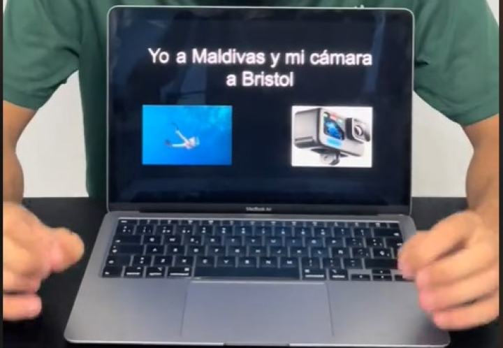 "Imagínate que te vas de viaje, pierdes 300 euros y te habla un nota para devolverte el dinero. Me ha pasado", ha comenzado el tiktoker el vídeo, que ha continuado enseñando una diapositiva en su ordenador en la que se lee: "Yo a Maldivas y mi cámara a Bristol".