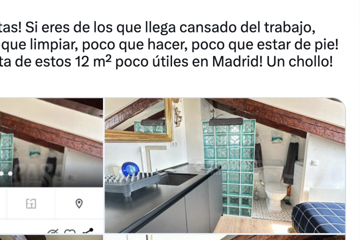 La cuenta El Zulista se encarga de recopilar anuncios de pisos que o bien son muy caros, o muy pequeños o, como en este caso, las dos cosas. "Buenas noches zulistas! Si eres de los que llega cansado del trabajo, este es tu zulo! poco que limpiar, poco que hacer, poco que estar de pie! por solo 650€ disfruta de estos 12 m² poco útiles en Madrid! Un chollo!", dice en la primera parte del tuit.