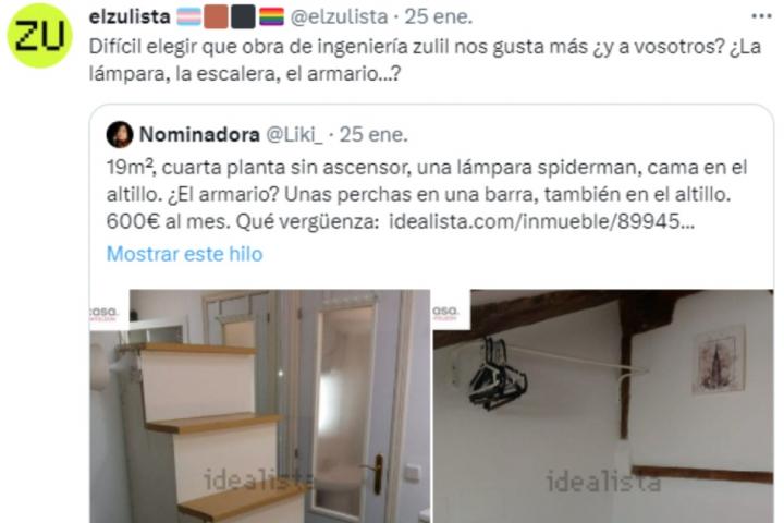 El anuncio, que ha sido ya eliminado del portal inmobiliario, por El Zulista, que se ha preguntado si lo mejor era la lámpara, el armario o la escalera. "Difícil elegir que obra de ingeniería zulil nos gusta más ¿y a vosotros? ¿La lámpara, la escalera, el armario…?", ha tuiteado.