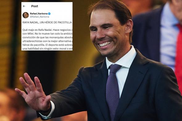 Al ver la escena, el escritor Rafael Narbona ha reaccionado con un duro revés desde la red social X. "RAFA NADAL, UN HÉROE DE PACOTILLA. Qué majo es Rafa Nadal. Hace negocios con Arabia Saudí y confraterniza con Milei", ha expuesto.