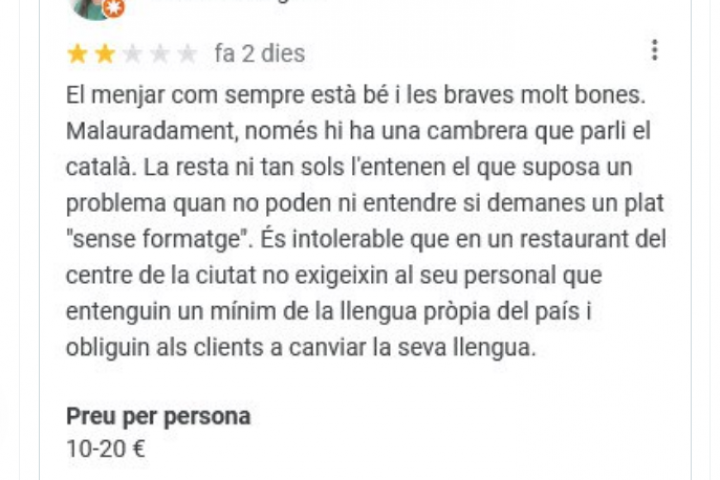 En su reseña, la comensal admitía que la comida estaba bien, pero le puntuaba con dos estrellas sobre cinco porque "solo hay una camarera que habla catalán". Según señalaba, ni siquiera entienden ese idioma, lo que supone un problema "si no pueden ni entender que pides un plato sin queso".