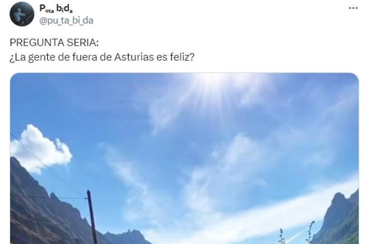 Junto a la fotografía, en la que se puede ver como el tuitero está desayunando en una ubicación privilegiada, en medio de un monte y con un cielo totalmente despejado, éste ha publicado la frase: "Pregunta seria: ¿La gente de fuera de Asturias es feliz?".